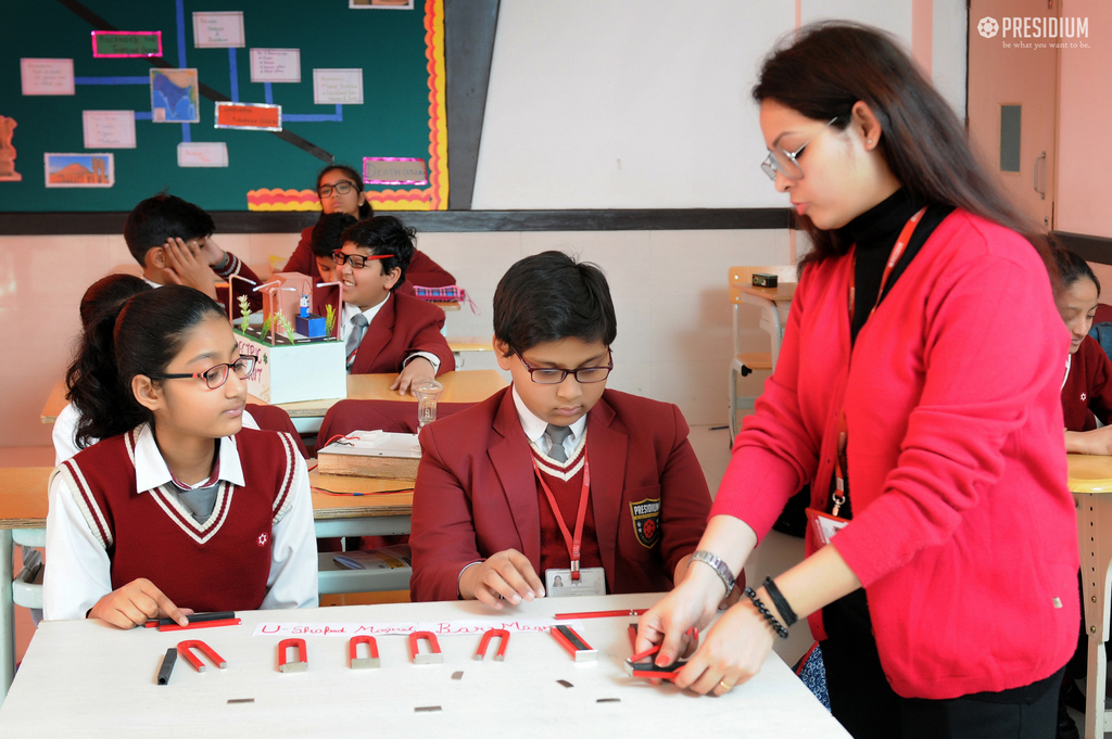 Magnets are fun to play with and teach us a lot. Even our planet has a magnet within, that aligns itself as north and south poles. The students of grade 6 performed an activity related to magnets with guidance of their science teachers. Magnets of various sizes and types were used to determine their poles and laws of attraction. Students also used various other elements to study what attracts magnets and what repels it. This helped them learn various concepts and laws related to magnets in a fun way.